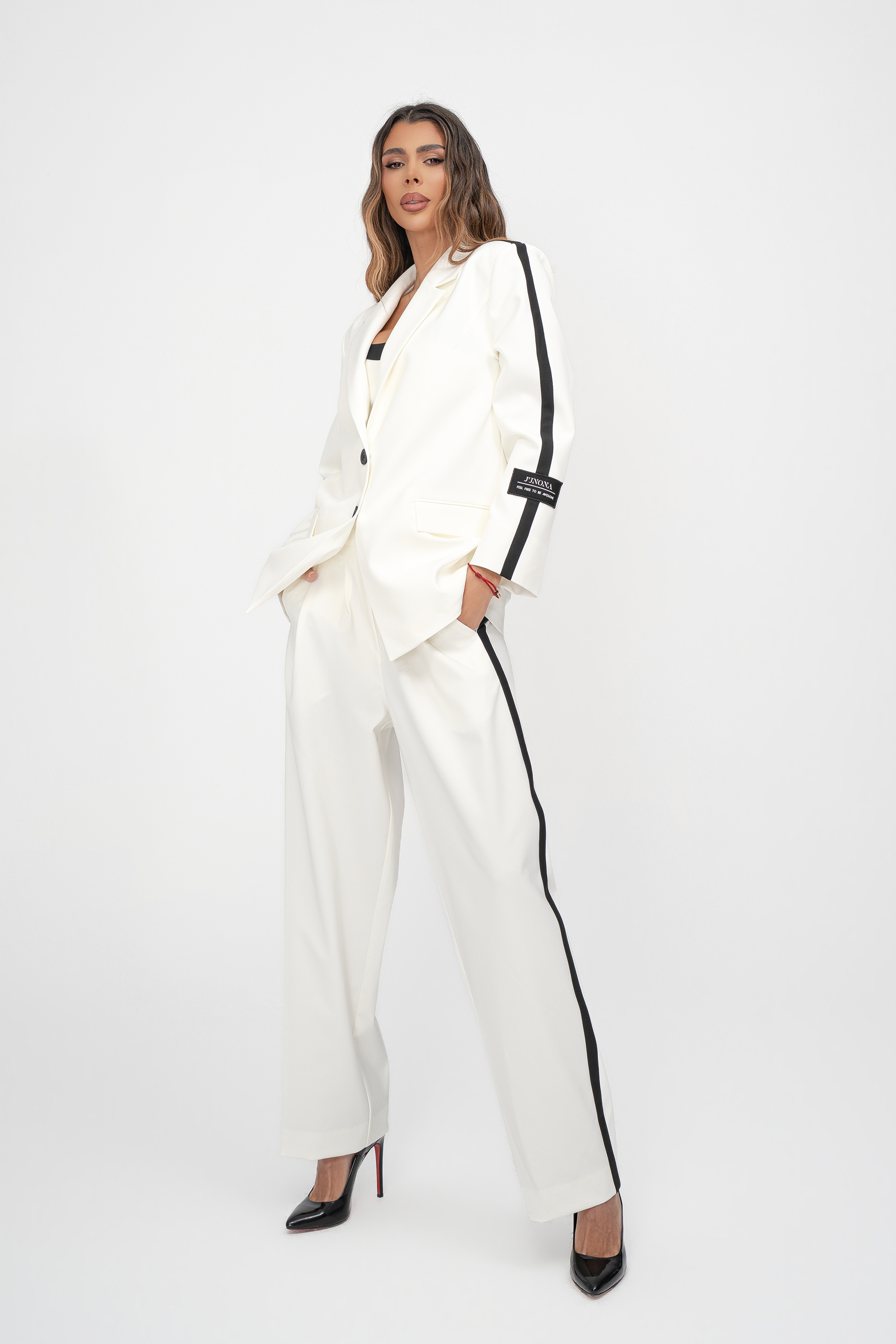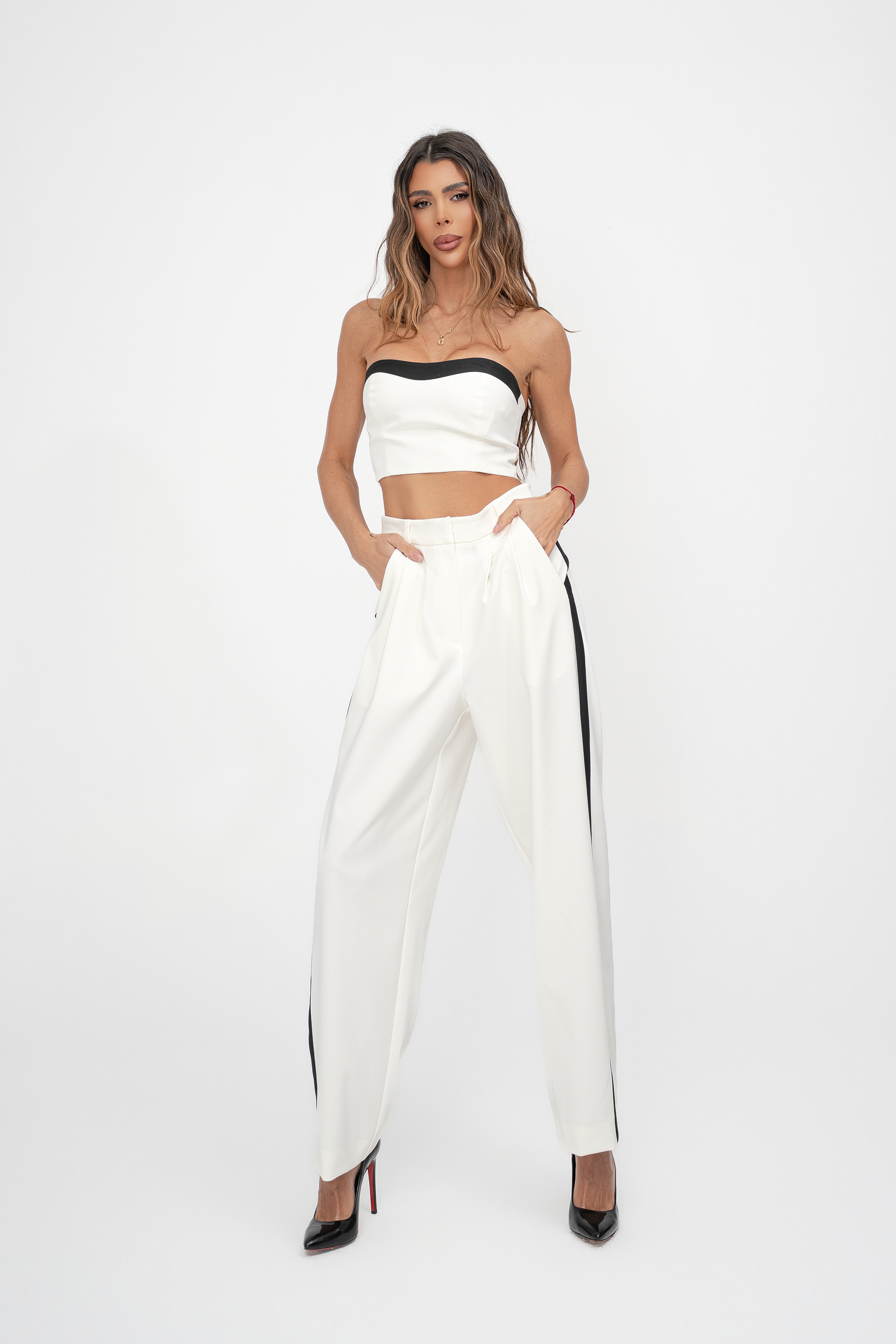 Описание: Оувърсайз панталон Junona с двойни басти и черен кант. С джобове и закопчаване с копчета в предната част.