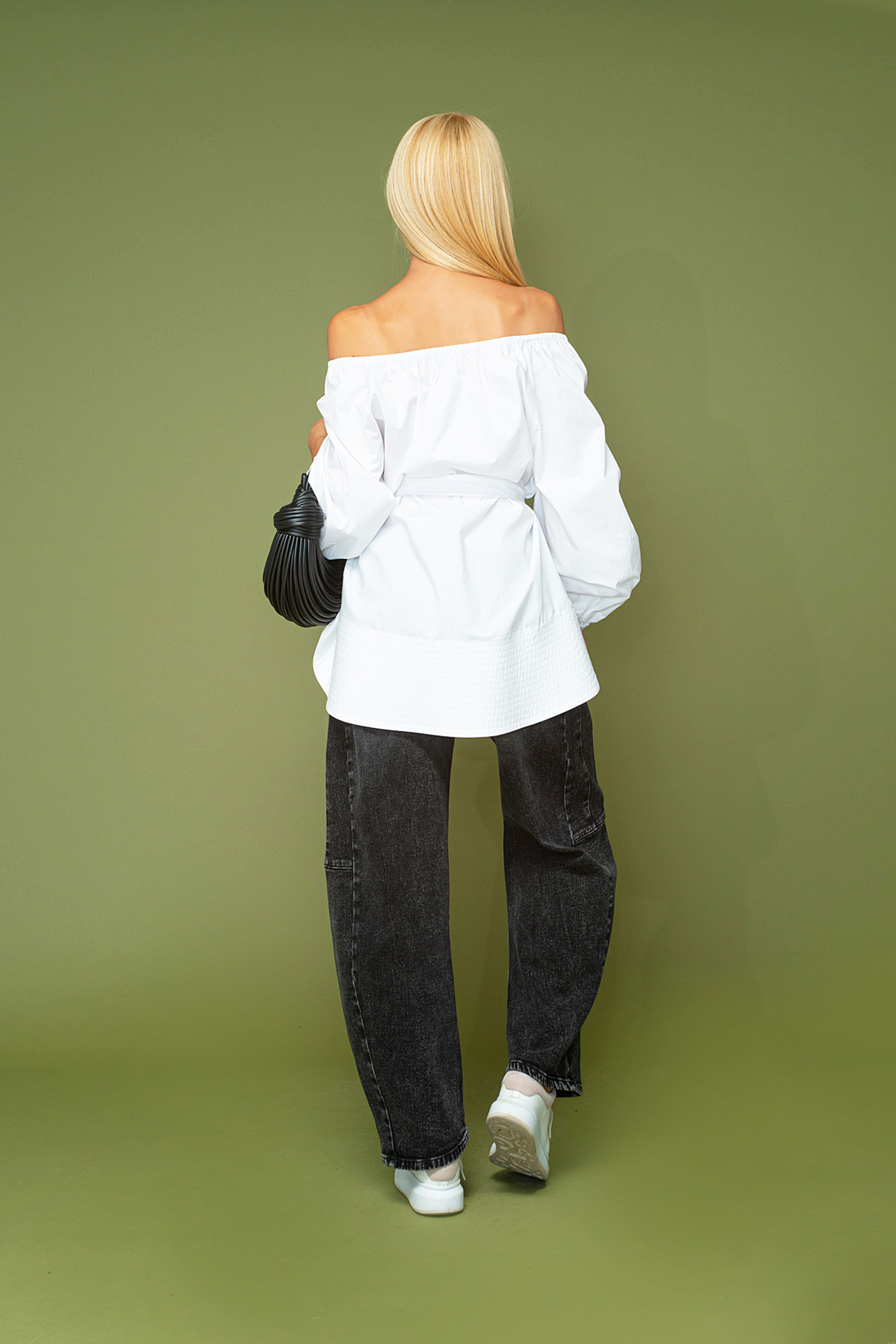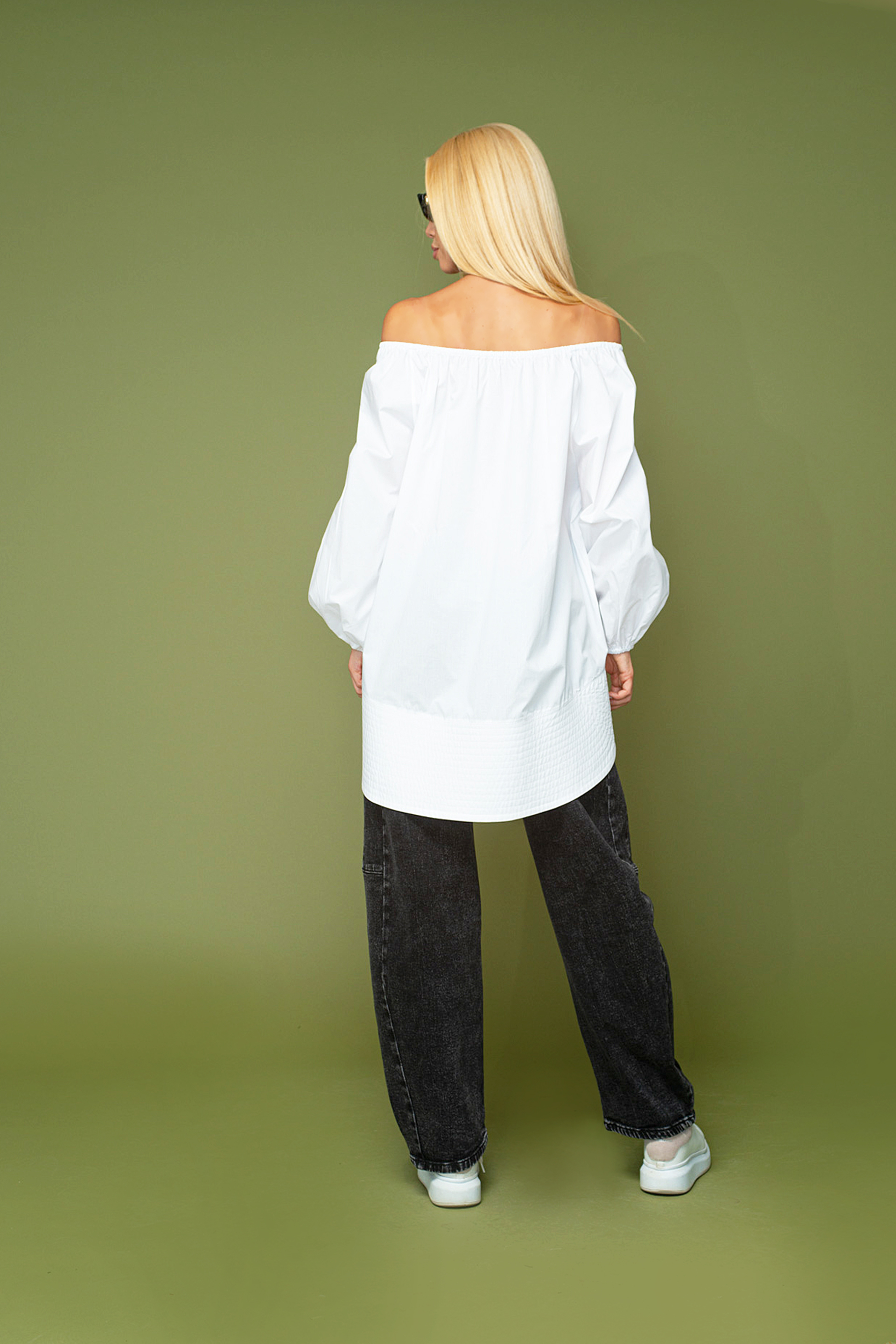 Описание: Риза тип туника изработена от памучна материя. С голи рамене и дълъг ръкав с ластичен маншет. Капитонирана долна част и колан от същата материя.