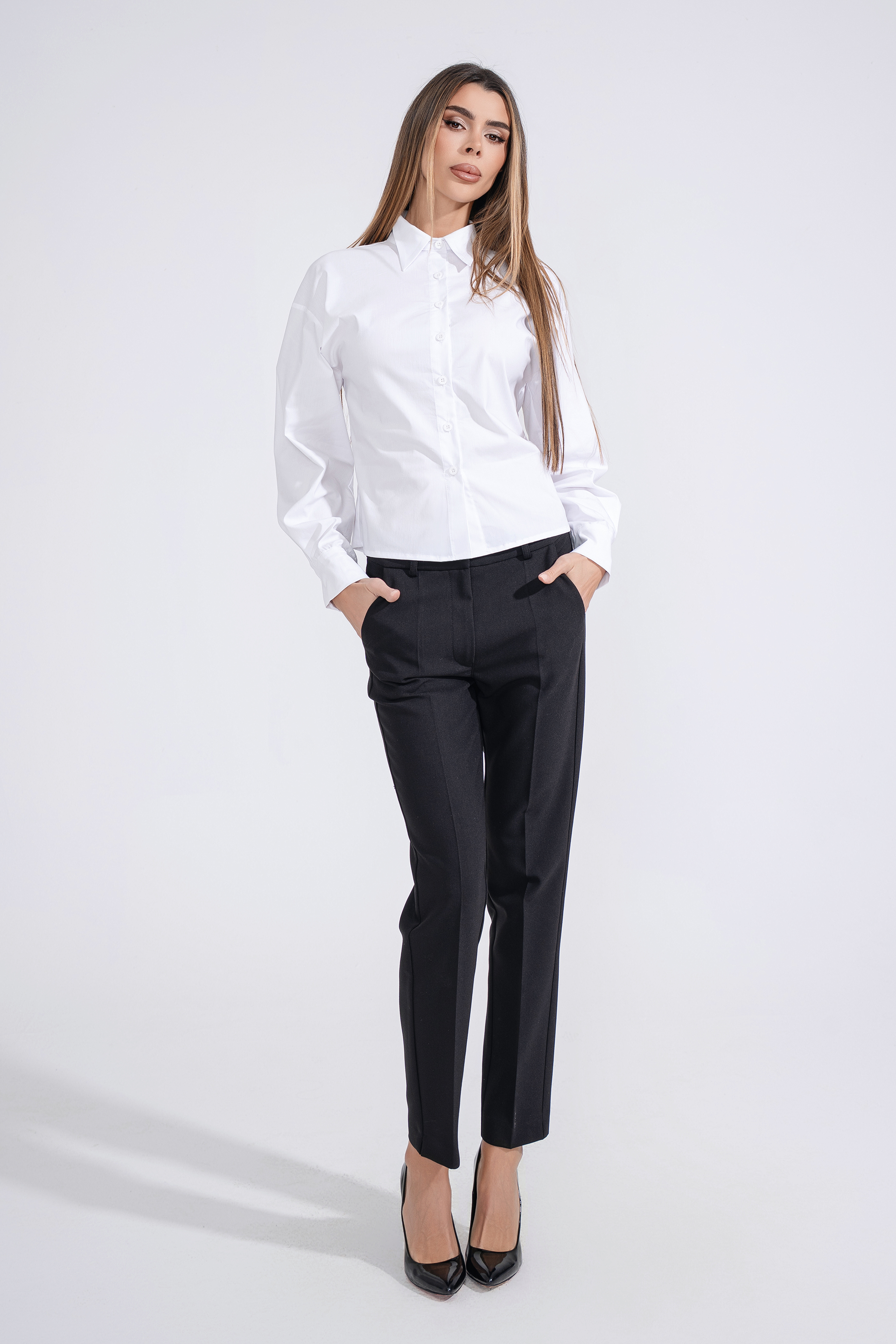 Описание: Панталон със средна талия и стеснен крачол с ръб. Странични джобове и задни джобове с филетка. Закопчаване отпред с цип, копче и метални кукички.
