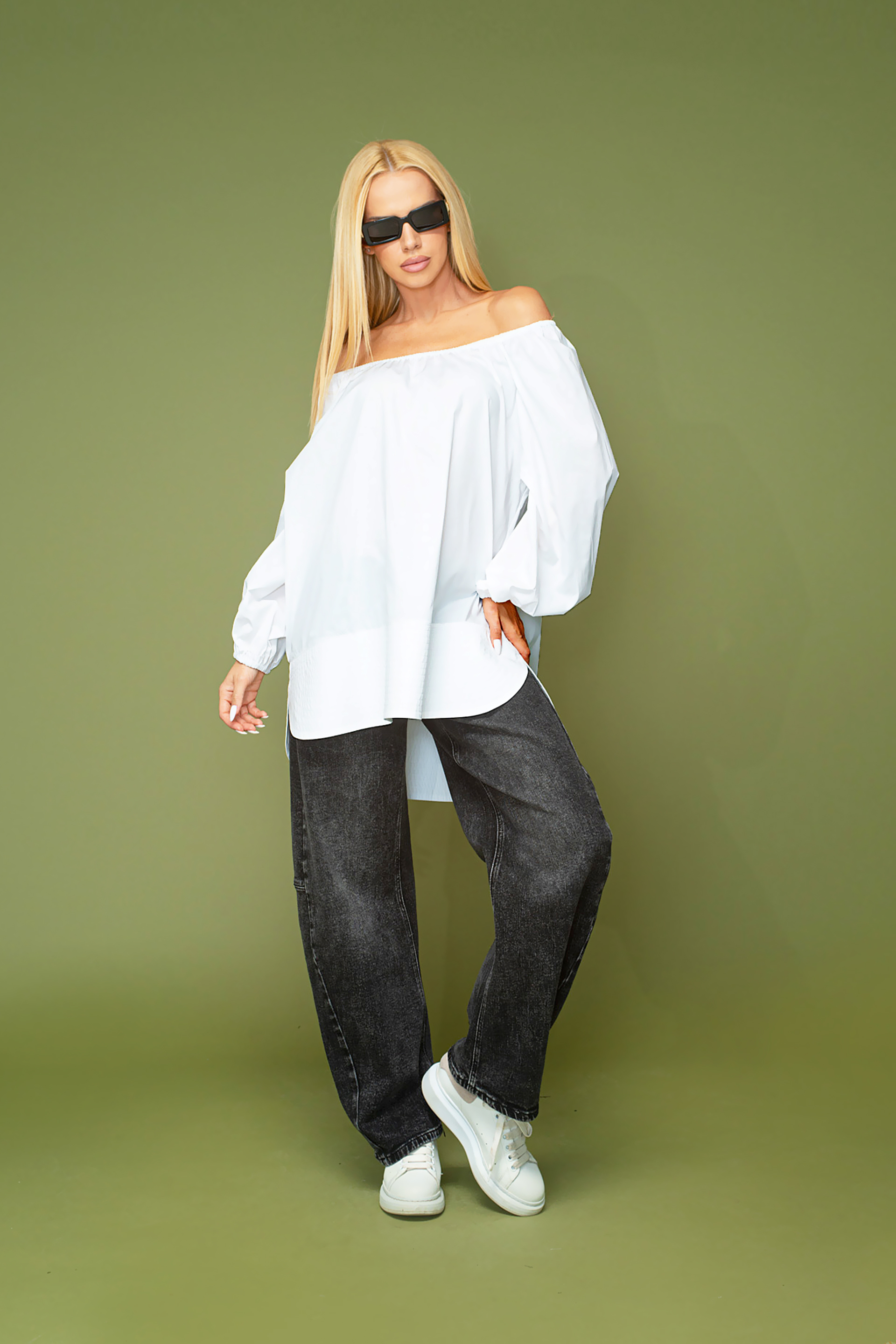 Описание: Риза тип туника изработена от памучна материя. С голи рамене и дълъг ръкав с ластичен маншет. Капитонирана долна част и колан от същата материя.