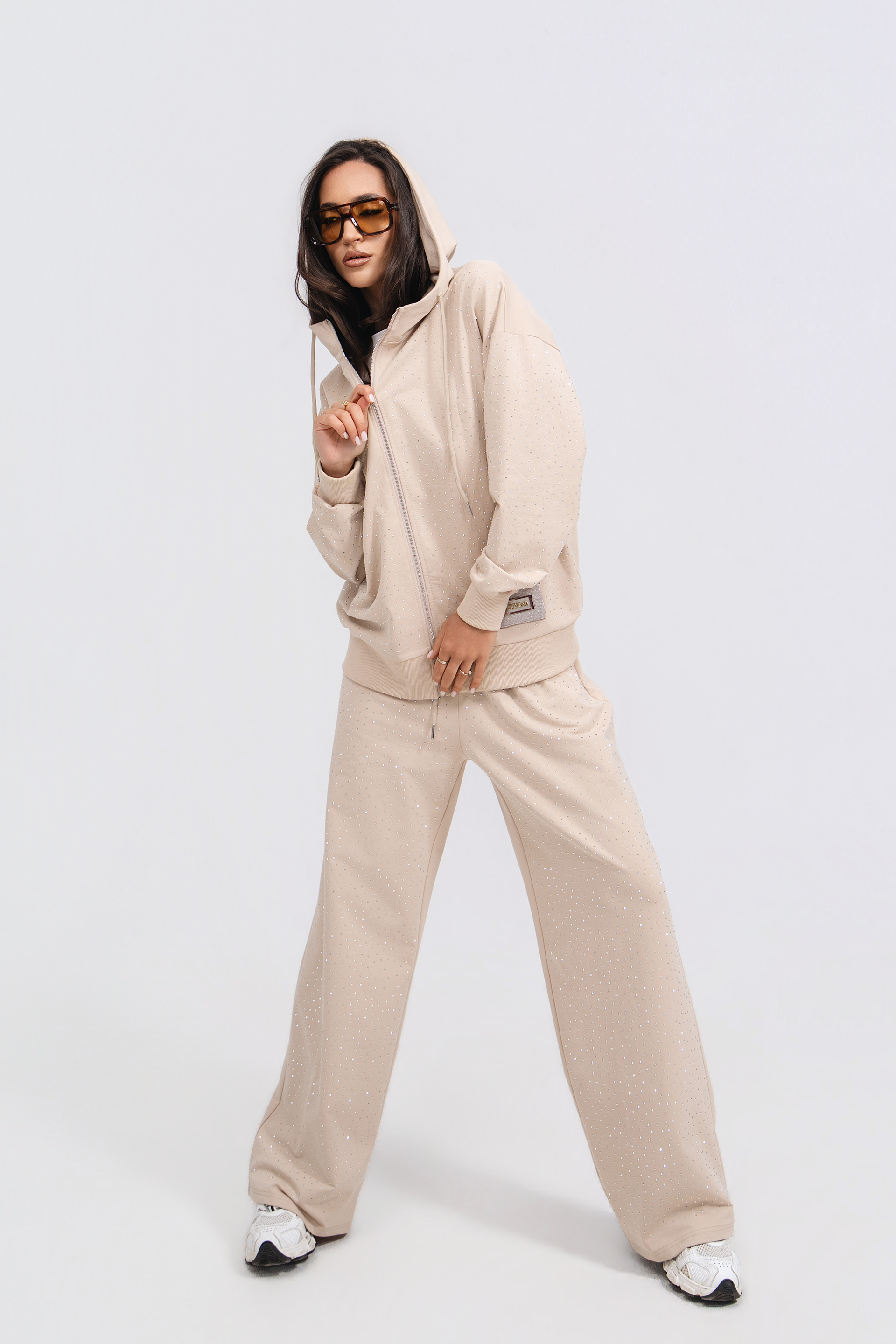 Описание: Спортен комплект от две части. Суитшърт със свободна кройка, дълъг ръкав с маншет и качулка с връзки. Закопчаване с цип. Панталон със свободна кройка и еластичен колан с връзки. С два джоба.
